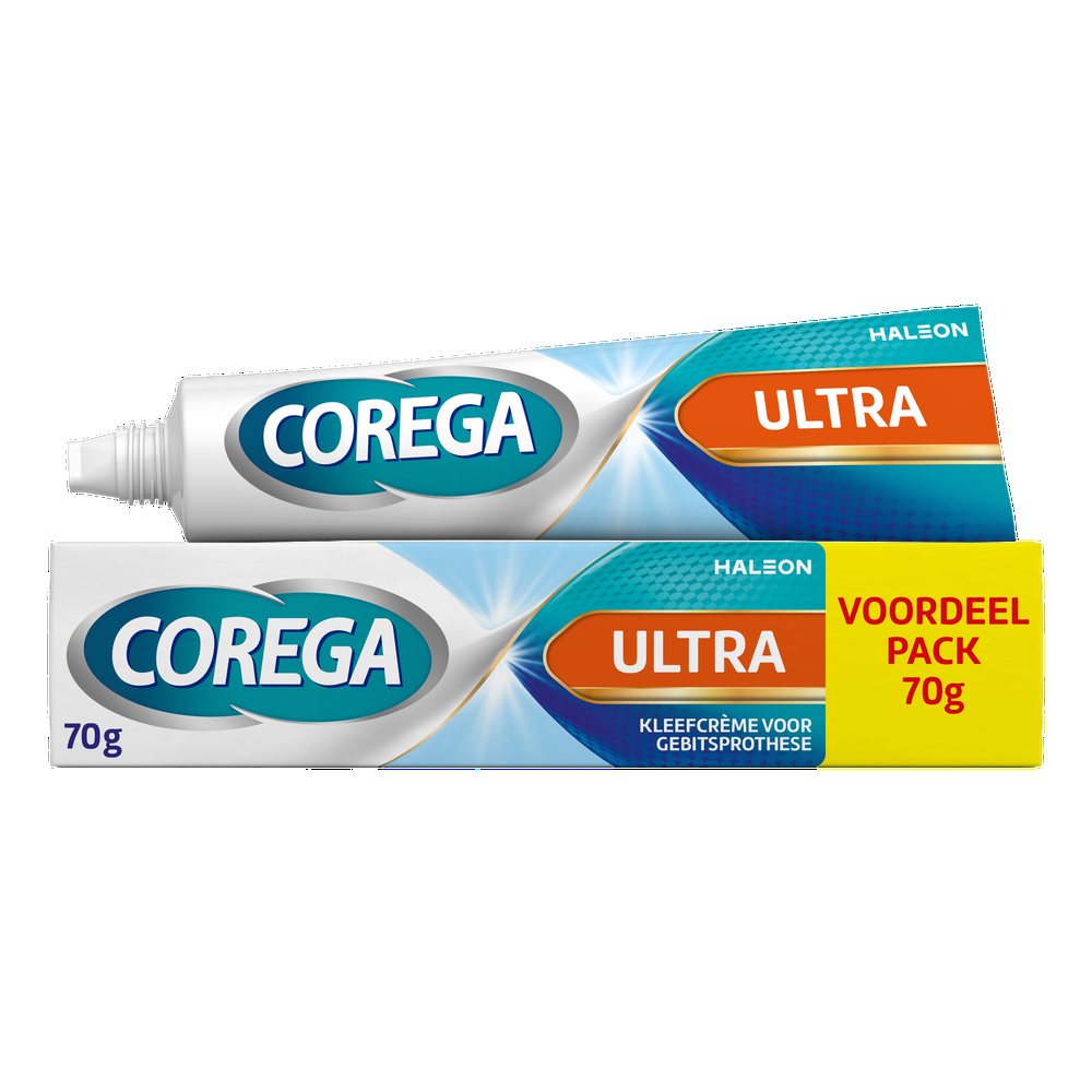 De crème zorgt ervoor dat uw gebitsprothese de hele dag goed vast zit. Wat is Corega Kleefcrème Ultra Voordeel Pack 70GR?Corega Kleefcrème Ultra Voordeel Pack voor gebitsprothese (40gr) heeft een tweevoudige werking.