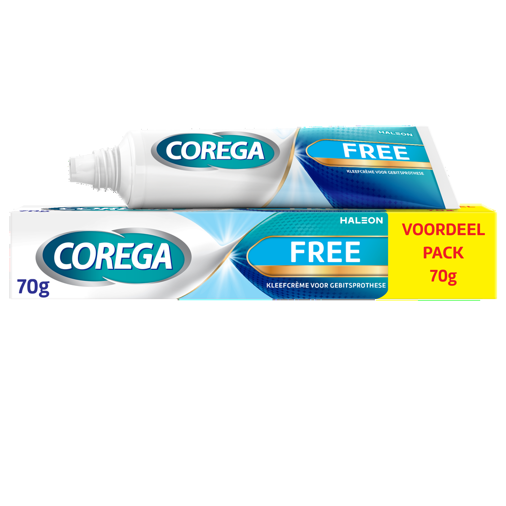 Wat is Corega Kleefcrème Free Voordeel Pack 70GR?Met Corega Free kleefcrème voor gebitsprotheses zorgt u ervoor dat uw gebitsprothese de gehele dag een stevige houvast heeft voor een prettige fixatie die voedselresten helpt buiten te houden.