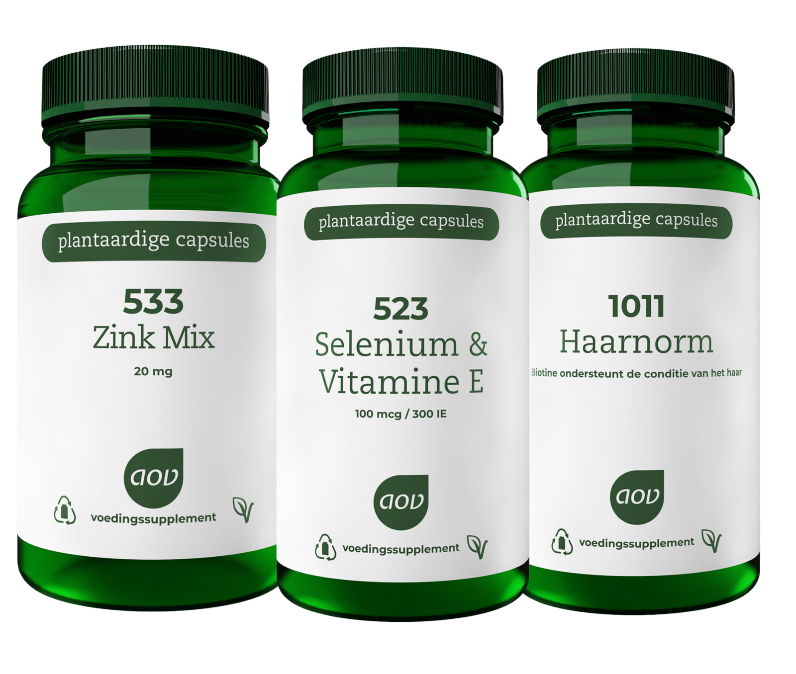 AOV Huid, Haar en Nagels Bundel bevatten dagelijkse supplementen ter aanvulling op uw voeding, voor uw huid (zink), haar (biotine) en nagels (selenium).AOV Huid, Haar en Nagels Bundel bestaat uit:1x AOV 1011 Haarnorm Capsules 60VCP - 1011 Haarnorm Capsules bevat een mix van.