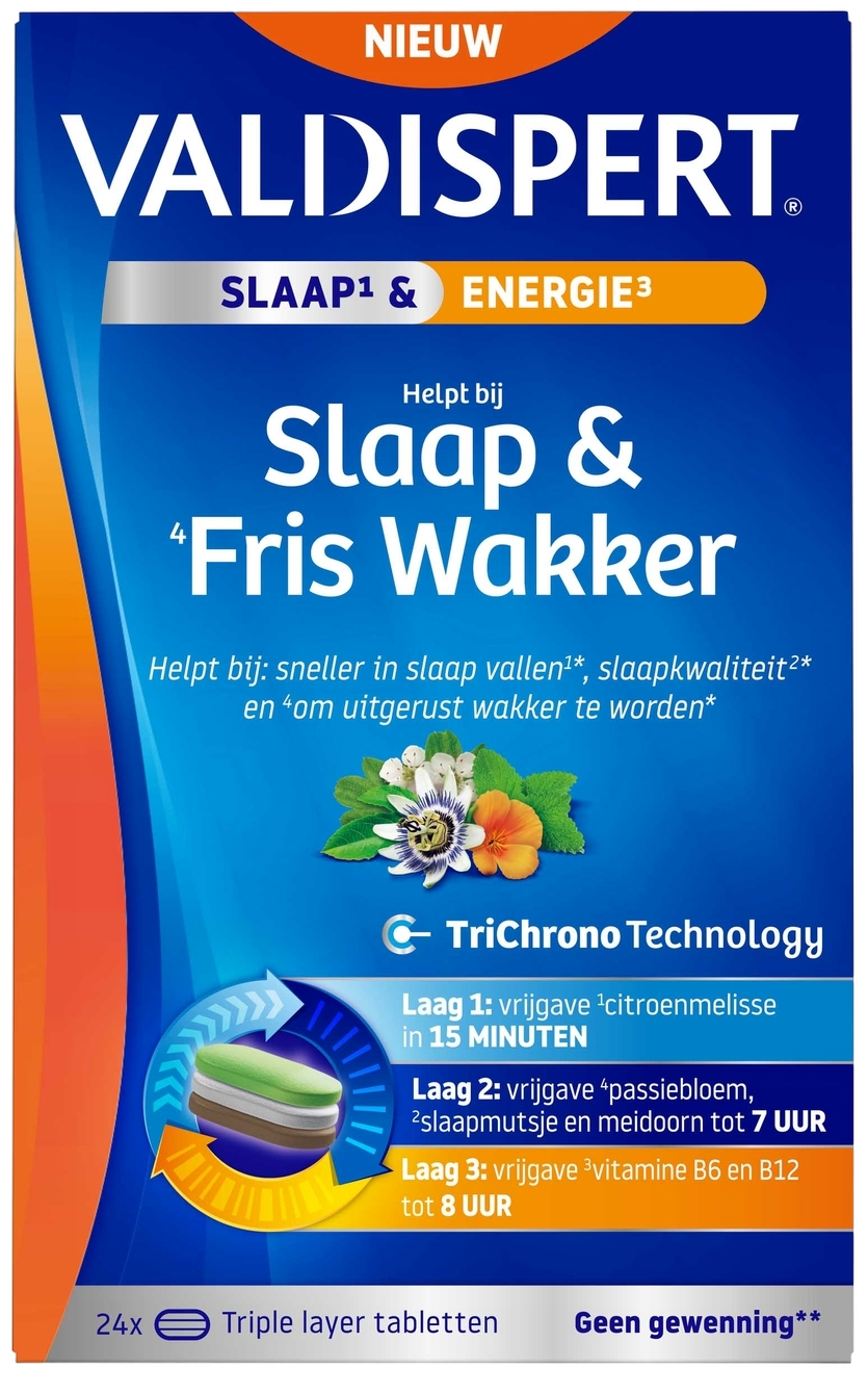 Valdispert Slaap & Fris Wakker Tabletten (24 stuks) is een voedingssupplement en bevat onder andere Citroenmelisse, Slaapmutsje, Passiebloem, vitamine B6 en B12.
