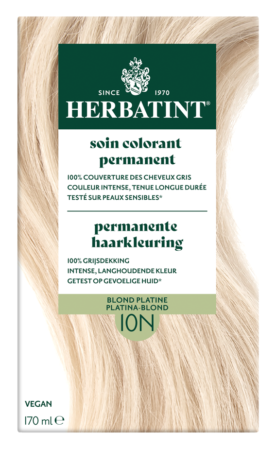 Wat is Herbatint Permanente Haarkleuring Platina-Blond 10N 170ML?Herbatint Permanente Haarkleuring Platina-Blond 10N is een natuurlijke en milde haarkleuring zonder ammoniak en met 100% grijsdekking.
