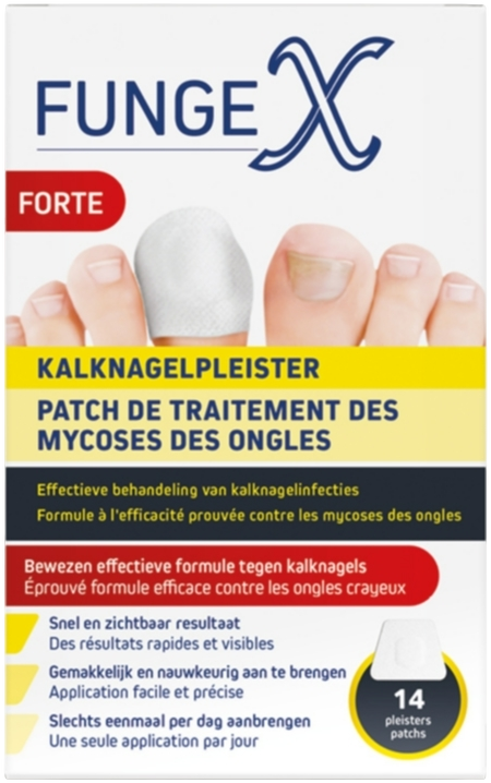 FungeX Kalknagelpleister Forte (14 stuks) is een medisch hulpmiddel voor de effectieve en intensieve behandeling van kalknagels en verkleurde, vervormde (teen)nagels.