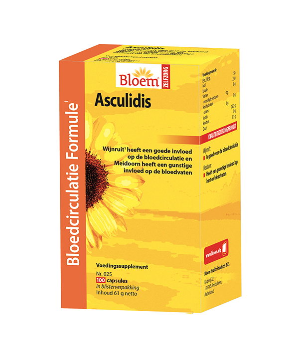 Wijnruit heeft een goede invloed op de bloedcirculatie, terwijl meidoorn gunstig is voor hart en bloedvaten. Bloem Asculidis Extra is een plantaardig voedingssupplement met een mix van plantenextracten, waaronder wijnruit en meidoorn.