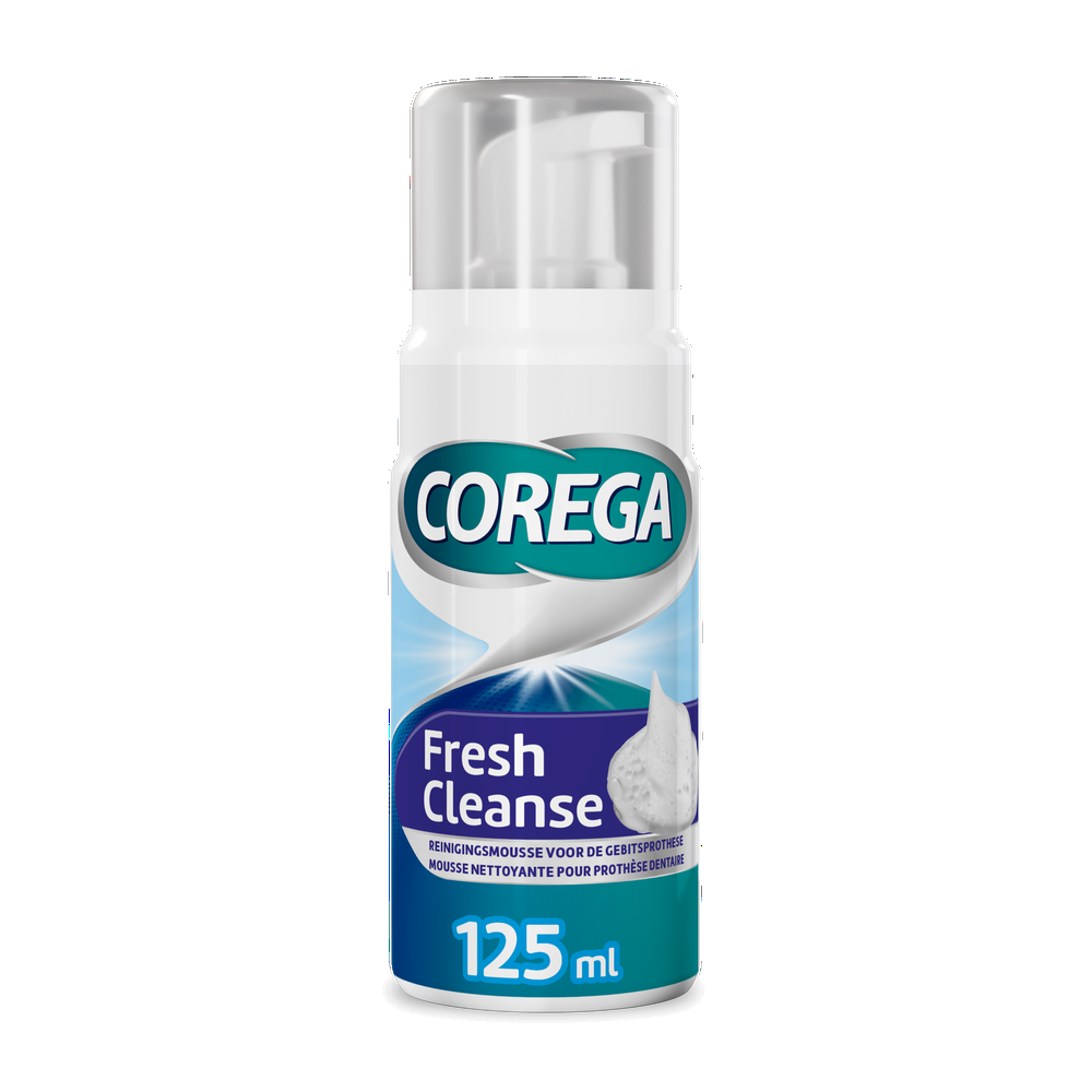 Door de schuimende mousse hoeft uw kunstgebit niet te weken. Wat is Corega Fresh Cleanse Mousse kunstgebitreiniger 125ML?Met de Corega Fresh Cleanse Mousse kunt u uw kunstgebit dagelijks op een snelle en efficiënte manier reinigen.