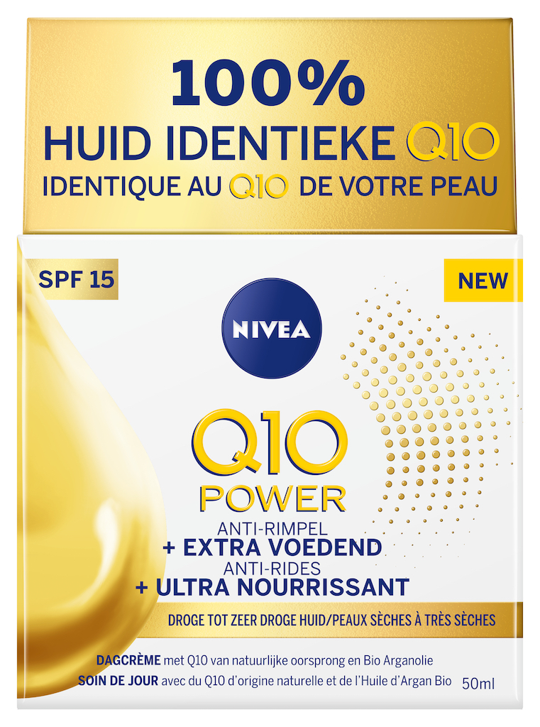 De huideigen Q10 zorgt ervoor dat het huidverouderingsproces wordt geremt. Nivea Q10 Power Anti-Rimpel + Extra Voedende Dagcrème bevat een combinatie van Q10, Creatine en Arganolie om de droge tot zeer droge huid optimaal te verzorgen.