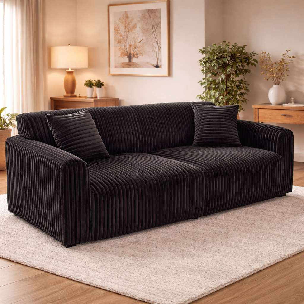 Een bank met duidelijke lijnen die rust en structuur brengt in de woonkamer..