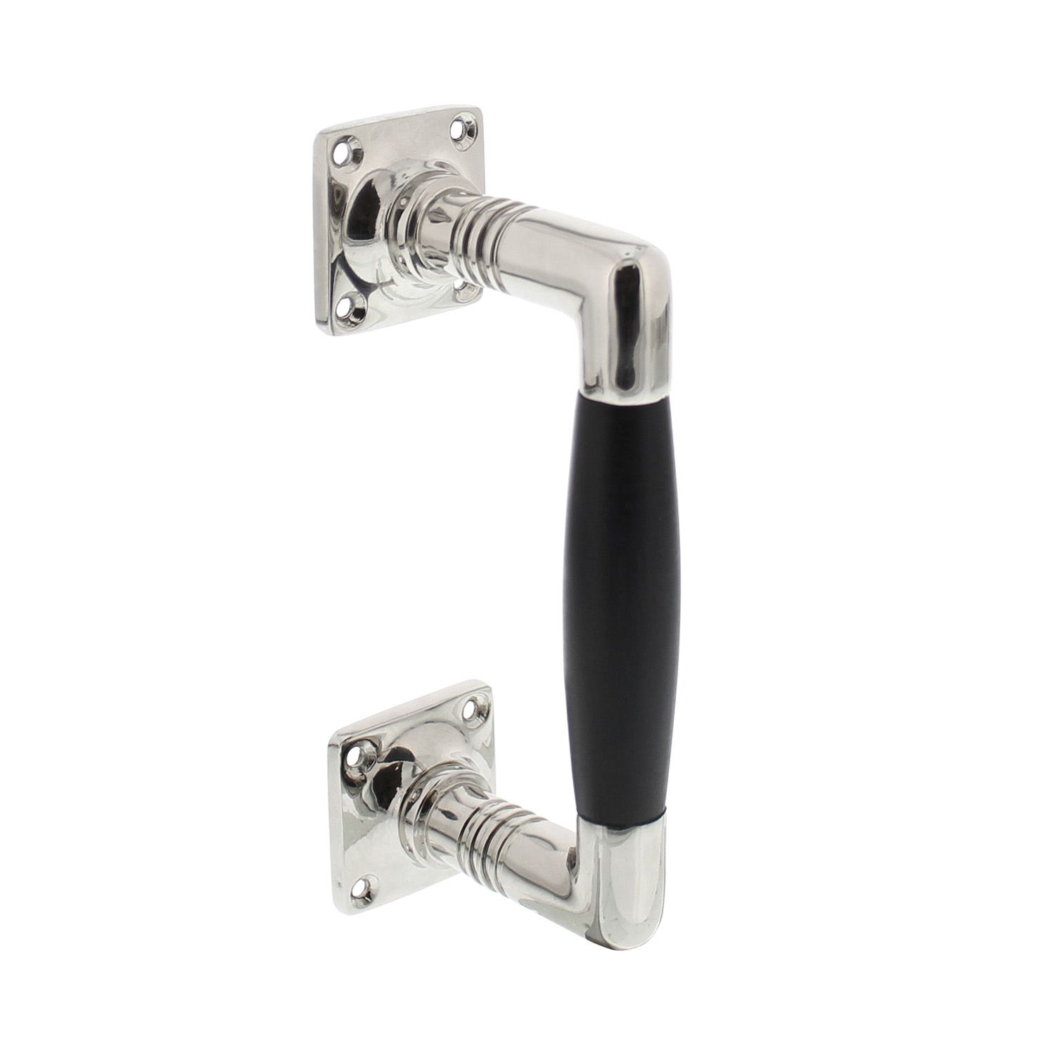 Deze deurgreep op vierkante opschroevende voet heeft een afmeting van 150 mm. Deze strakke deurgreep in Ton model is uitgevoerd in ebbenhout en nikkel en naderhand gepolijst, waardoor het een glanzende uitstraling heeft.