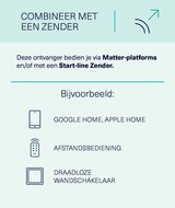 Google Home, Apple Home) Voor bediening van Vaste lampen 2-weg status terugkoppeling Ja, via Matter-platform(s) Aantal kanalen Max. Dit is een apparaat dat de verbinding legt tussen je slimme apparaten en je netwerk.Voorbeelden van geschikte Matter-hubs zijn: Google Nest Hub (2e generatie) Google Nest Hub Max Google Nest WiFi Pro Apple HomePod (mini en 2e generatie) Apple TV 4K WiFi + Ethernet Samsung SmartThings StationSpecificaties Typenummer MAWD-250 Producttype Matter ontvanger, Start-line met Matter ontvanger Afmetingen 4,7 x 4,7 x 1,8 cm Verpakkingsinhoud Handleiding, Start-Line met Matter ontvanger Functionaliteit Dimmen, Schakelen, Smartphone bediening Toepassingsgebied Binnengebruik Werkt met Start-line zenders, Matter-platforms (o.a. In een hotelschakeling (twee wandschakelaars voor dezelfde lamp) kun je de overige schakelaar blijven gebruiken.Heb je al een Matter-hub?Om Matter-apparaten te gebruiken, heb je een Matter-hub nodig. Filamentstand – speciaal voor filament-ledlampen, voorkomt zoemgeluiden en knipperen.Werkt in hotelschakelingDe MAWD-250 vervangt een bestaande wandschakelaar of draaidimmer.