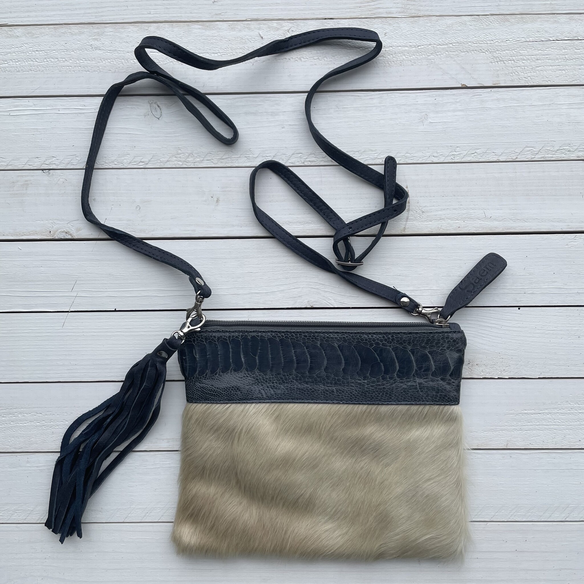 Tas Mickey Koeienhuid (Nguni) Struisvogel Creme Blauw 25X20cm Ga naar Lederstore-nl