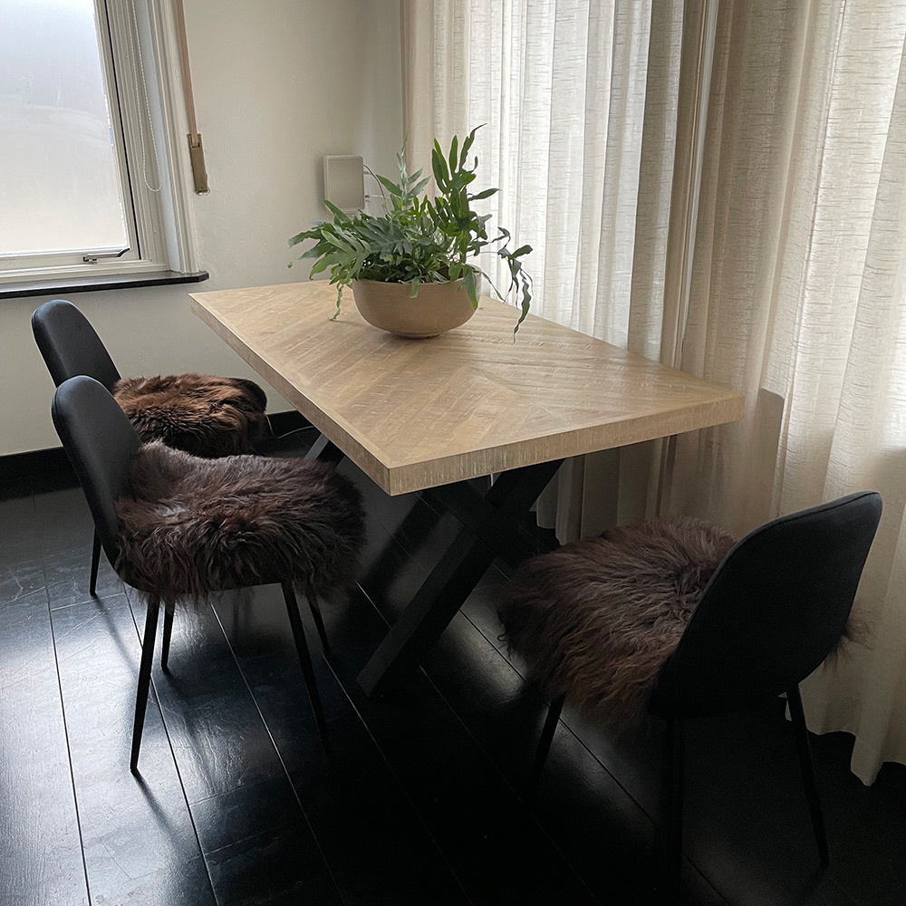 Koeienhuid decoraties/Schapenvacht stoelkussens.