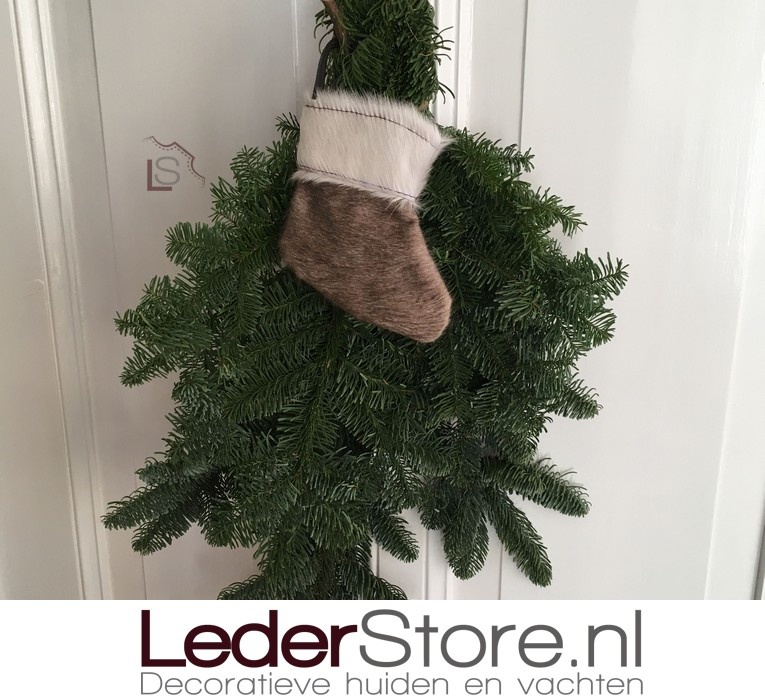 Naam | Koeienhuid Kerstsok Taupe Wit 15X14cm |
