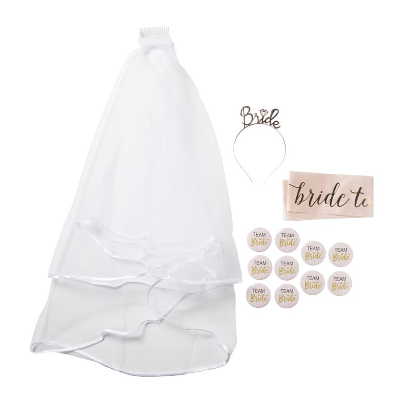Inhoud bride to be set: * Een lange sluier * 10 buttons met 'I'm with the bride' * Een sjerp met 'bride to be' * Een tiara met 'bride'.
