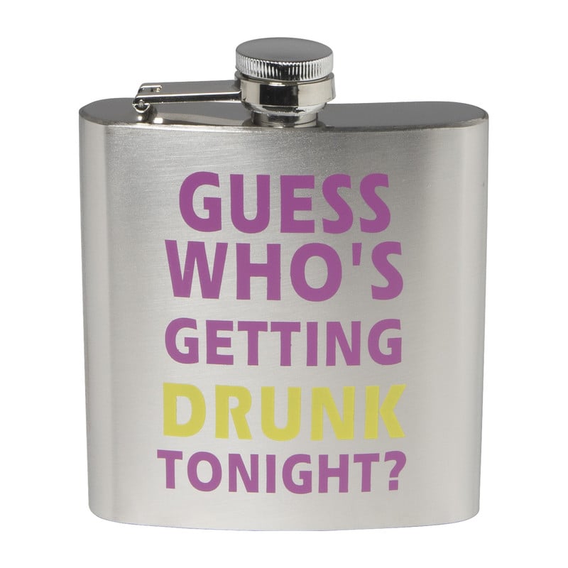 Op de zwarte flacon staan de woorden 'Guess who's getting drunk tonight?' in roze en gele letters..