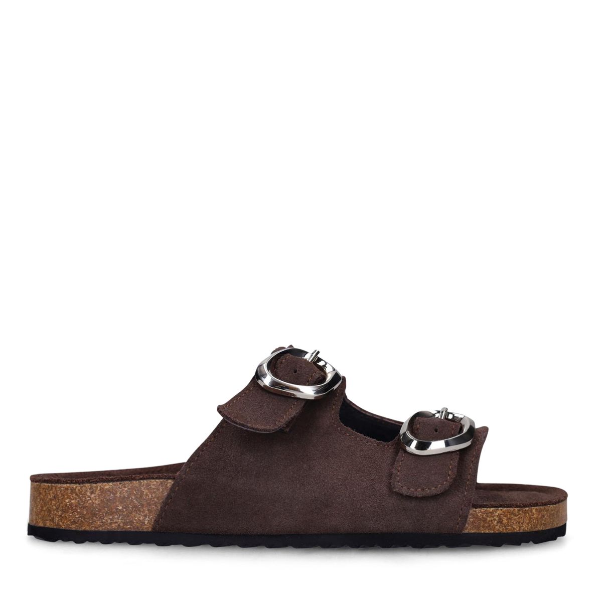 De slippers hebben een zooldikte van 3 cm. De slippers hebben twee brede banden met zilverkleurige buckles.
