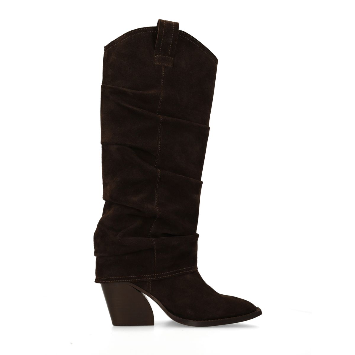 Hiernaast hebben de western boots een puntige neus en een western hak met een hoogte van 8 cm. De bruine hoge cowboylaarzen hebben een suède flap met gerimpelde details wat zorgt voor een statement afzak-effect.