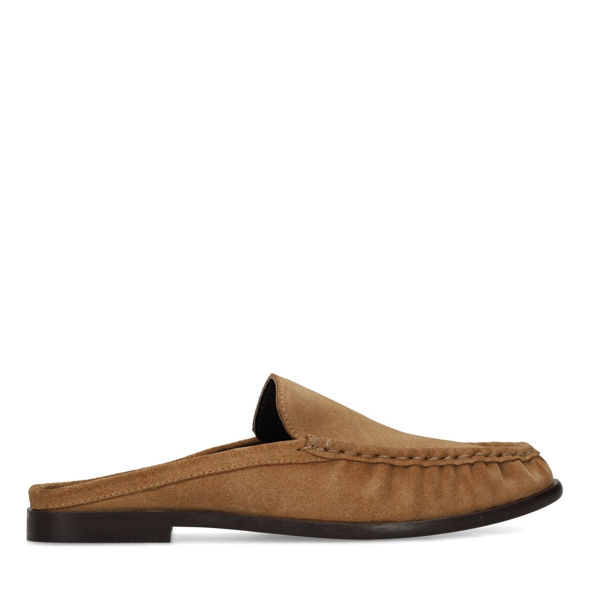 De instappers hebben een platte hak van 1 cm en een rimpel design. Deze cognac suède instappers hebben het kenmerkende \'backless loafers\'design.