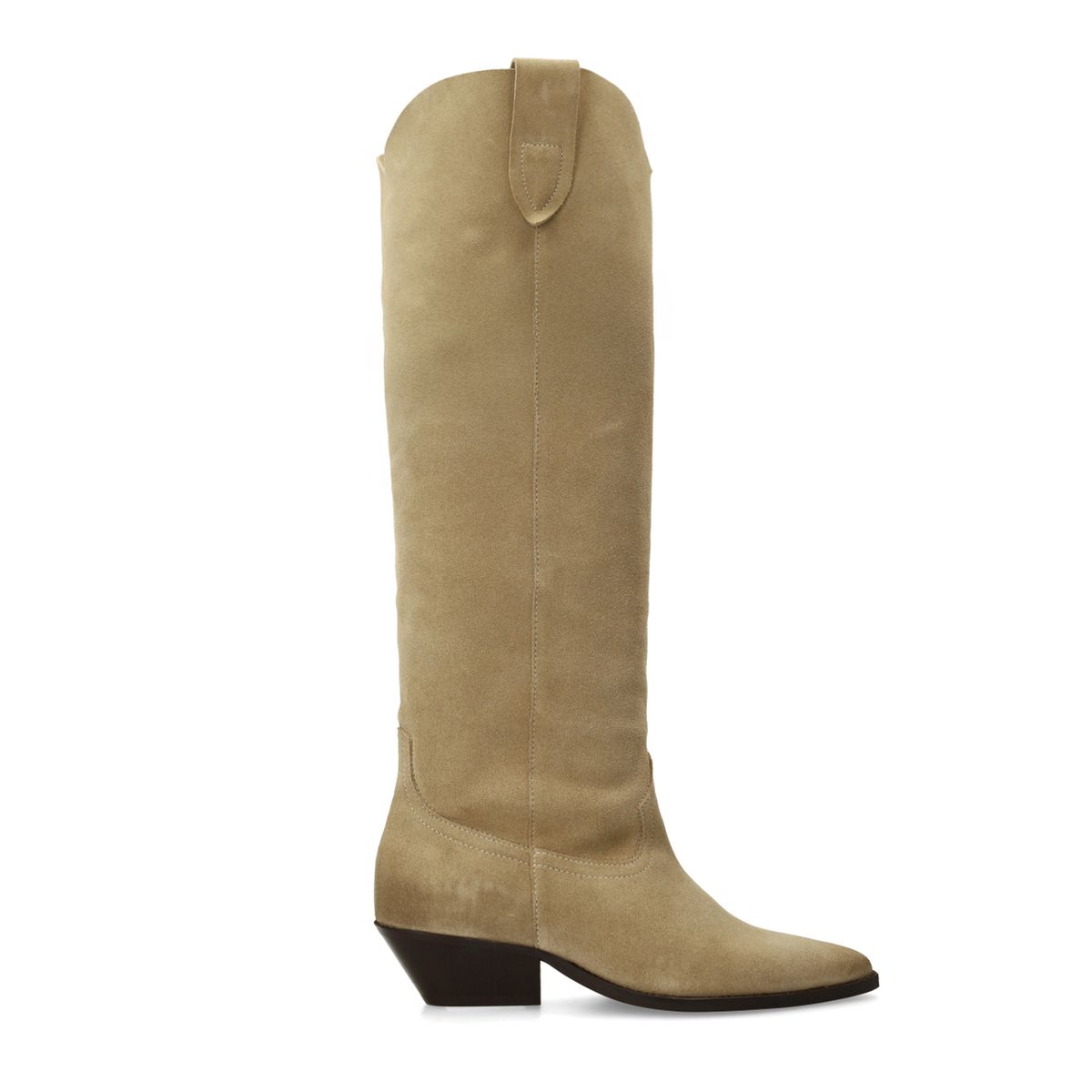 De buitenzijde is gemaakt van suède en de binnenzijde van leer. De beige hoge laarzen hebben een puntige neus en een blokhak van 5 cm hoog. Beige suède copwboylaarzen van Sacha. De verwachte levertijd is begin december.