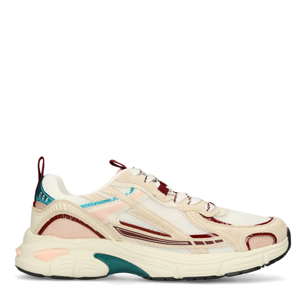 De witte sneakers hebben blauwe, bordeaux, roze en groene details op de upper en een golvende grove zool met een dikte van 4 cm..