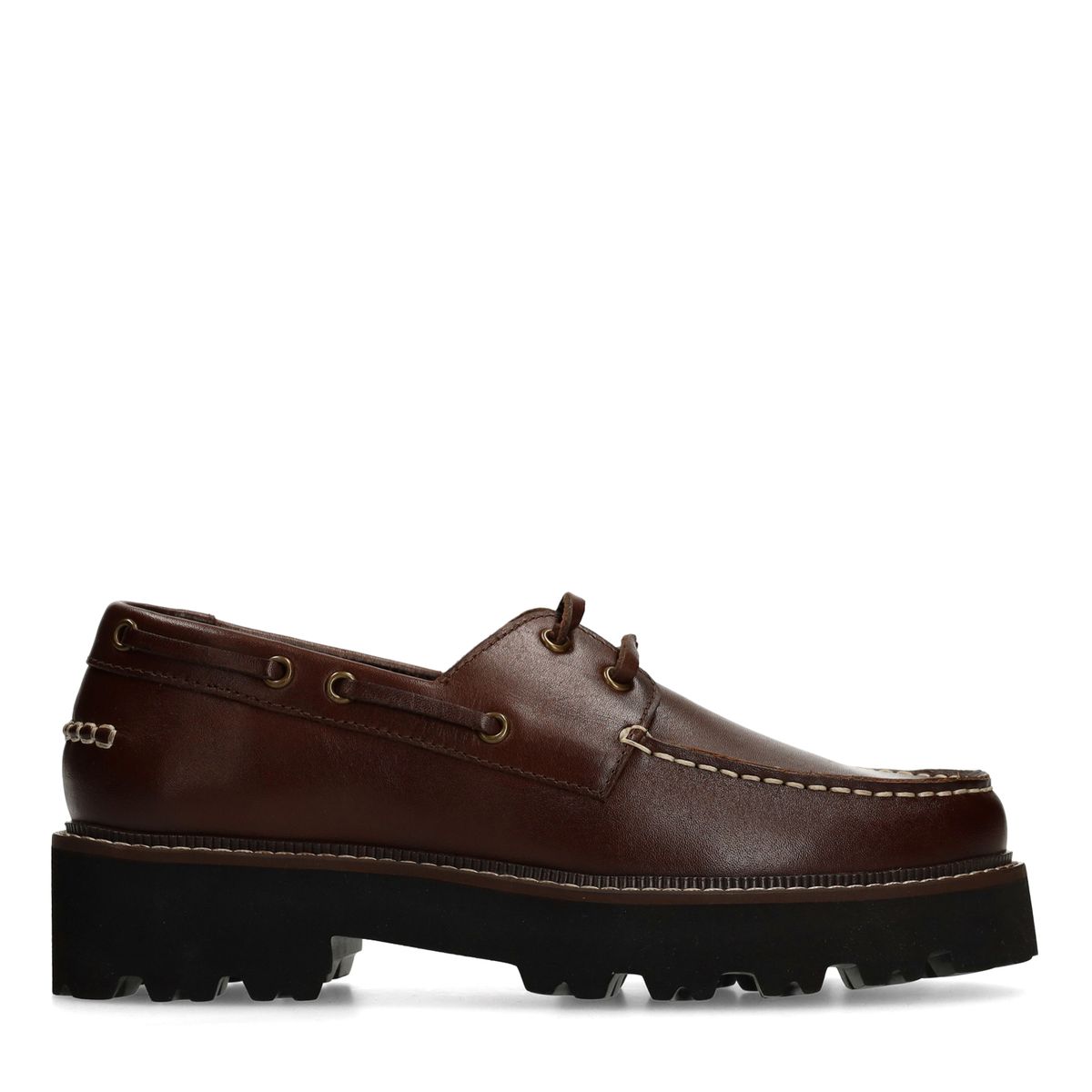 De instap bootschoenen zijn aan de buiten- en binnenzijde gemaakt van leer. Deze bruine leren bootschoenen van Sacha hebben een \'boat shoe\'design met vetersluiting.