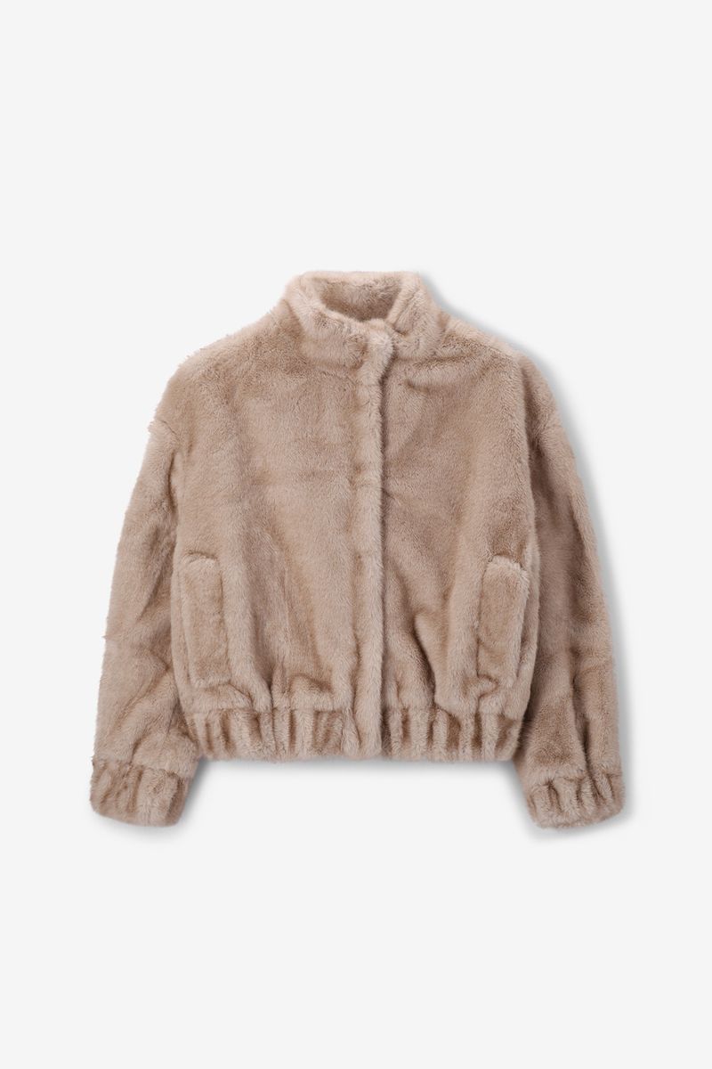Het model heeft een lengte van 1,72 m en draagt maat S. Daarnaast heeft het een hoge hals, een knoopsluiting, een binnenvoering, steekzakken en is het gemaakt van imitatiebont. Door het elastiek aan de onderzijde krijgt de jas een cropped look. De jas heeft lange mouwen met verlaagde schouders en een korte boxy fit.