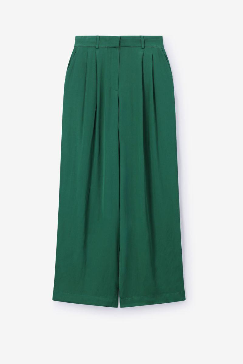 Het model heeft een lengte van 1,77 m en draagt maat S. Verder heeft de broek plooi-details en een groene kleur.