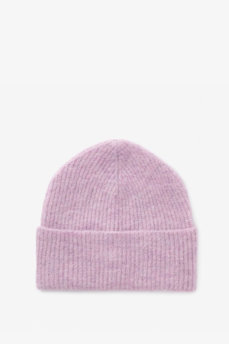 De muts heeft een omgeslagen rand, lichtpaarse kleur en is gemaakt met een gebreide kwaliteit stof. Lichtpaarse wollen muts van Sissy-Boy.