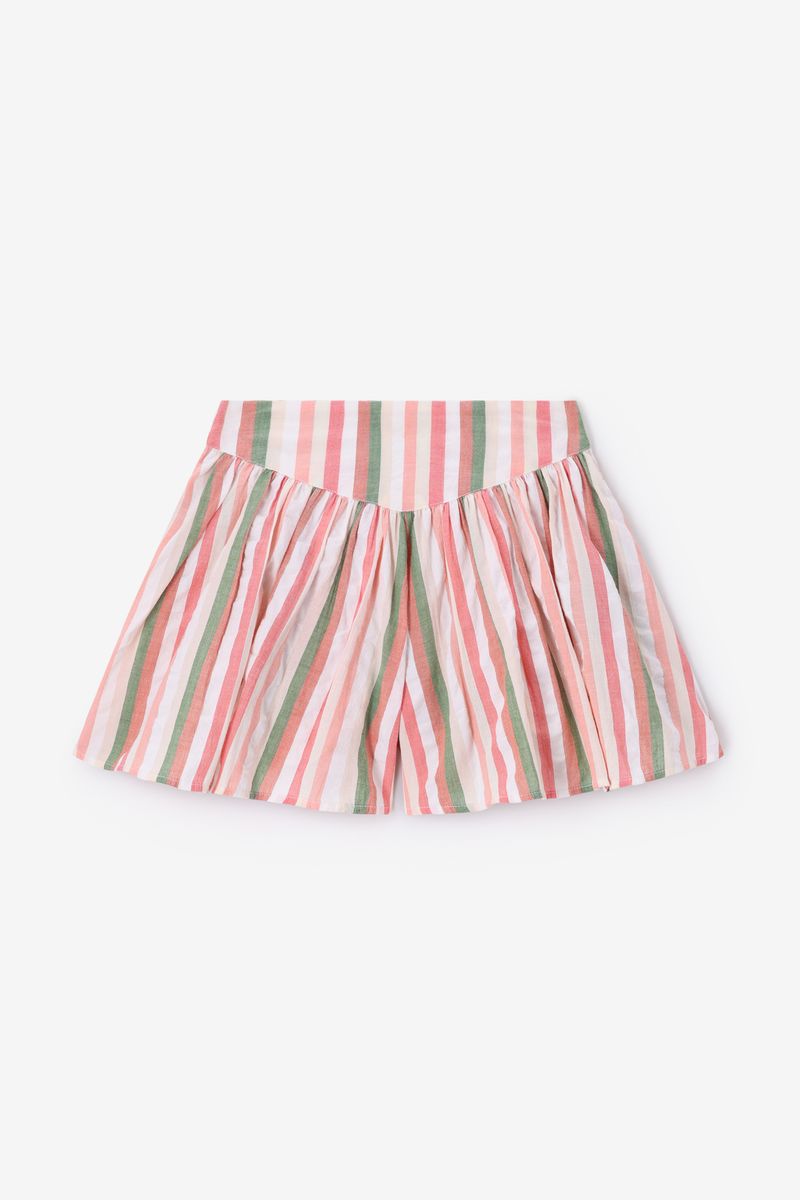 De skort heeft een elastische tailleband, een seersucker kwaliteit en een all-over roze, groene, beige en witte strepen design. Roze gestreepte skort van Sissy-Boy.