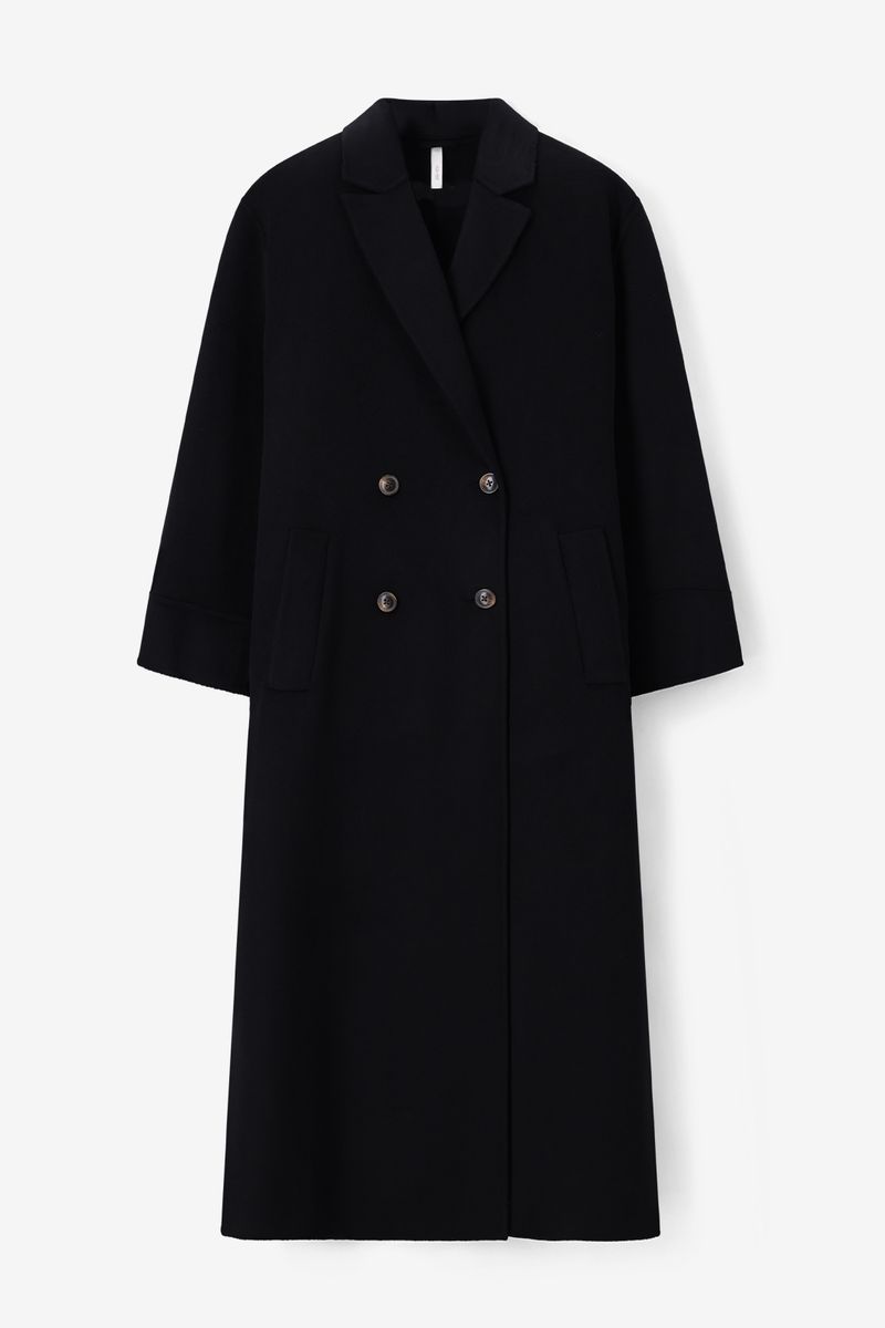 De jas heeft lange mouwen, een reverskraag, een knoopsluiting en steekzakken. Zwarte wollen jas van Sissy-Boy.