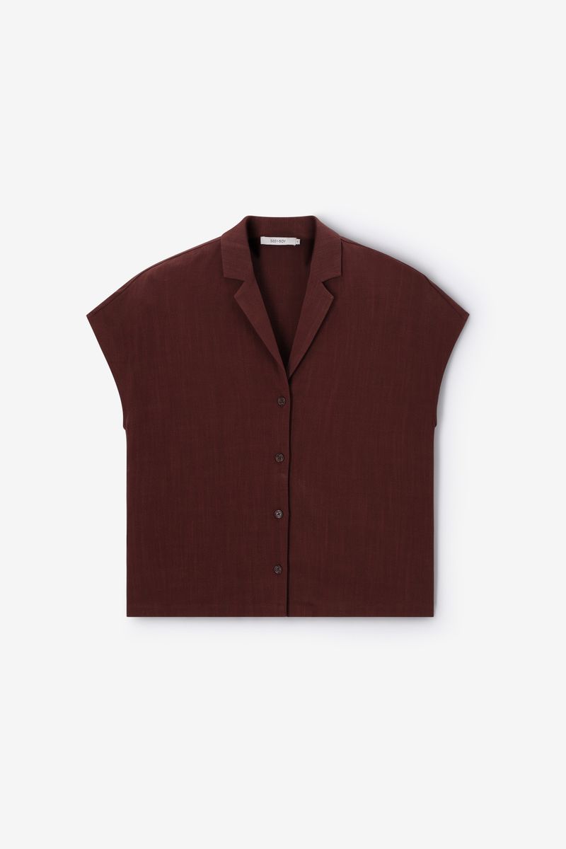 De blouse heeft korte aangeknipte mouwen, een omgeslagen kraag, knoopsluiting aan de voorzijde en een relaxed fit. Donkerbruine linnen blouse van Sissy-Boy.