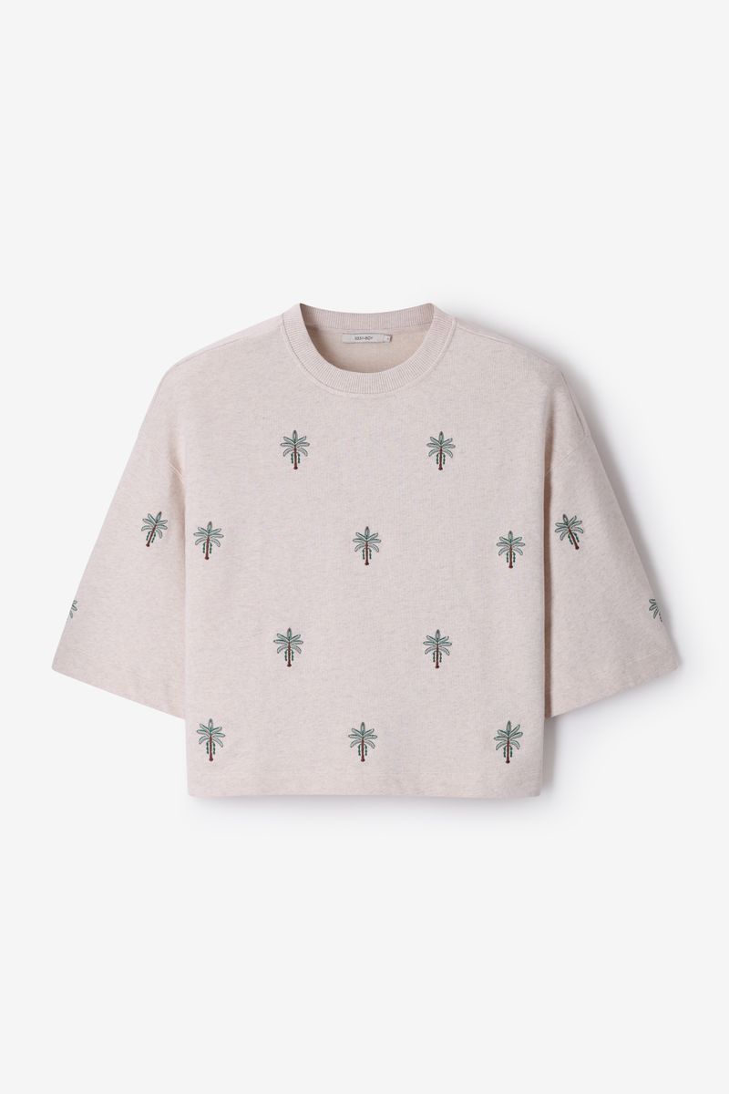 Verder heeft de sweater een beige kleur met palmbomen borduursels en splitten aan de zijkanten. De sweater heeft korte mouwen, een ronde halslijn en een boxy fit.