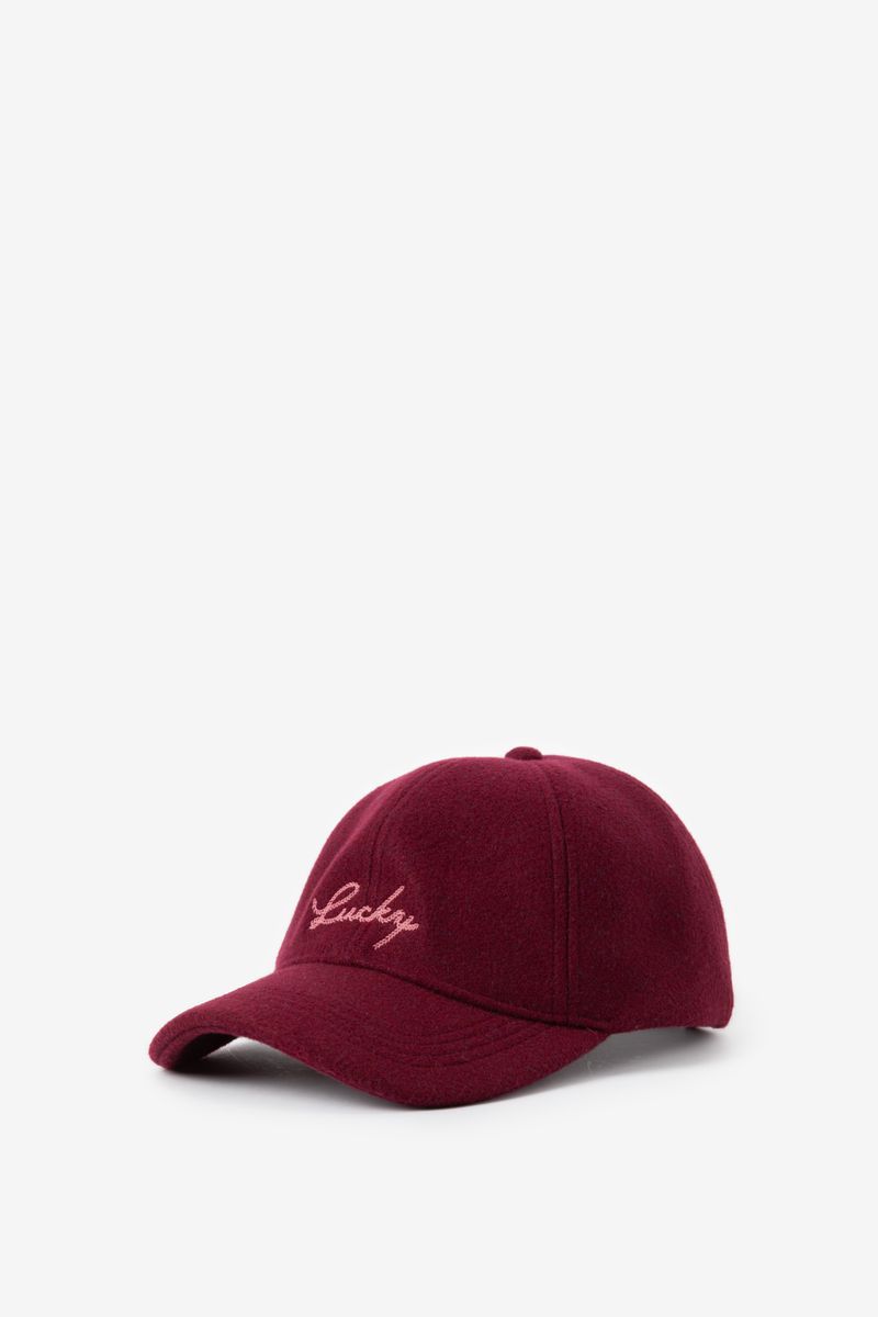 De pet heeft een rode kleur en heeft het woord \"Lucky\"in het roze opgestikt aan de voorzijde. "Donkerrode wollen pet met tekst van Sissy-Boy.