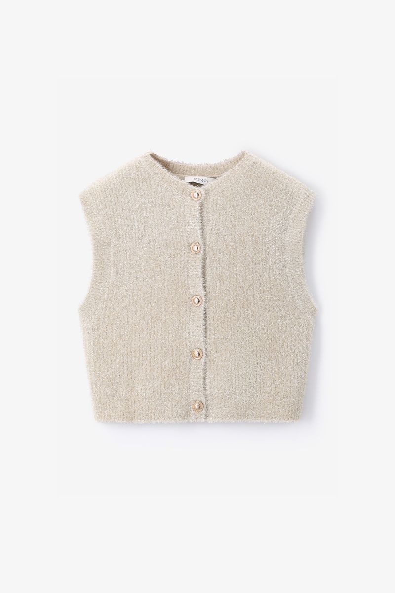 Verder is de spencer gemaakt van een harige witte fluffy stof met gouden details. De spencer heeft een ronde hals, ribboorden en drukknoopsluitingen.
