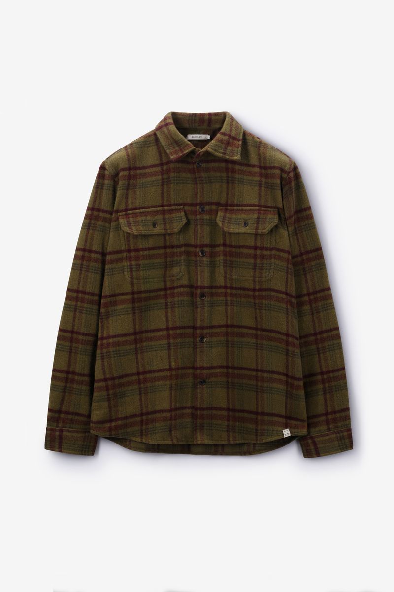 Het model heeft een lengte van 1,87 m en draagt maat M. Verder heeft het overhemd een all-over ruiten print met bruine details.