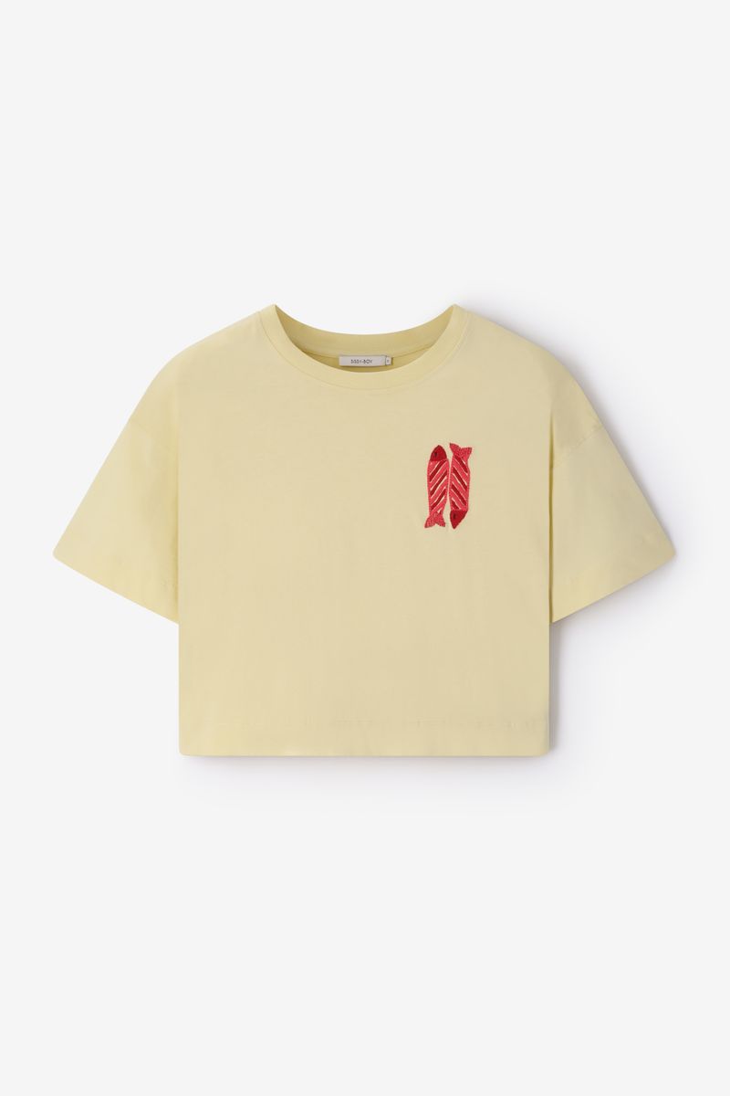 Verder heeft het T-shirt een lichtgele kleur met vissen borduursel aan de voorzijde. Het T-shirt heeft korte mouwen, een ronde halslijn en een relaxed fit.
