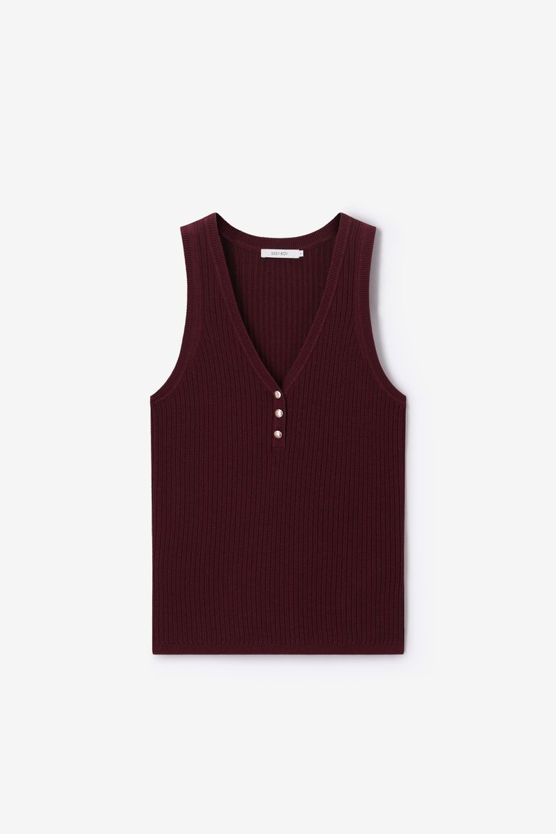 Verder heeft het singlet een all-over gebreide structuur in een donkerrode kleur. Het singlet heeft een V-hals, een gebreide kwaliteit, regular fit en een knoopsluiting bij de halslijn.