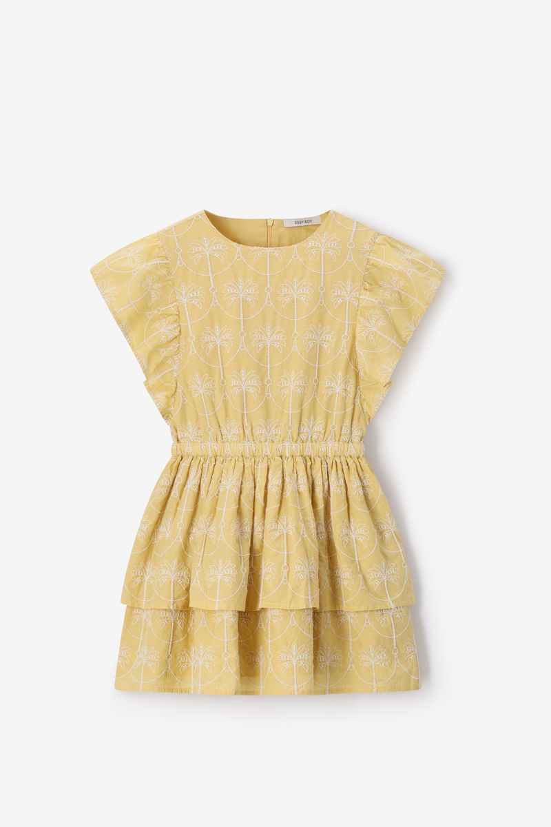 Verder heeft de jurk ruffles en all-over witte palmboom borduursels. De jurk heeft korte mouwen, een ronde halslijn, een elastische tailleband en een ritssluiting aan de achterzijde.