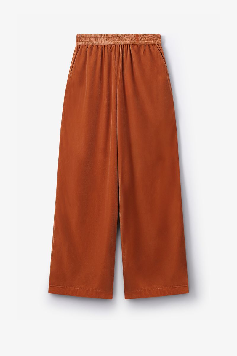 Verder is de broek gemaakt van een velvet kwaliteit stof. De broek heeft een hoge taille, elastische tailleband en wijd uitlopende pijpen.