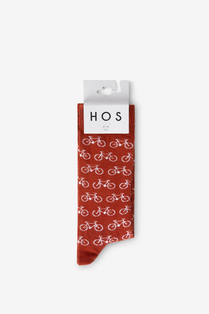 De sokken hebben een donkerrode kleur met een all-over fietsen print in een witte kleur. Donkerrode sokken met print van het merk Heroes on Socks.