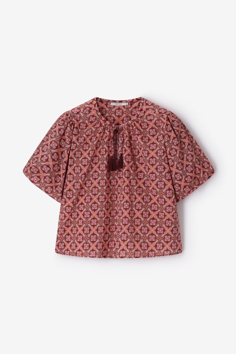 Verder heeft de top een donkerrode kleur met een all-over mozaïek print. De top heeft korte mouwen, een ronde halslijn, speelse fransjes en een regular fit.