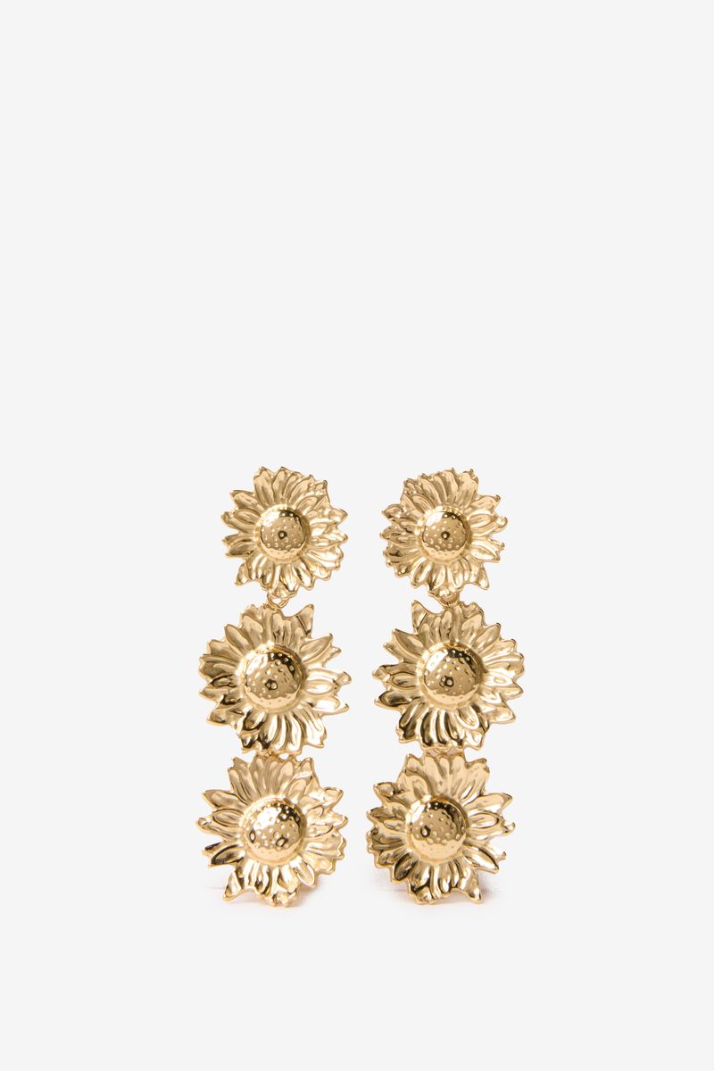 De oorbellen hebben een knopje met daaronder drie bloemetjes in verschillende groottes. Gouden oorbellen met bloemen van Sissy-Boy.