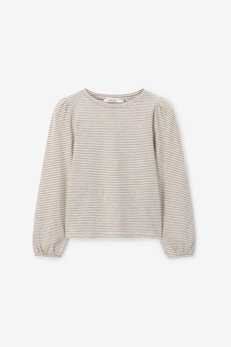Verder heeft het een all-over strepen design met een lichtroze hartjes detail op de voorzijde. Het T-shirt heeft lange pofmouwen, een hoge ronde halslijn en een regular fit.