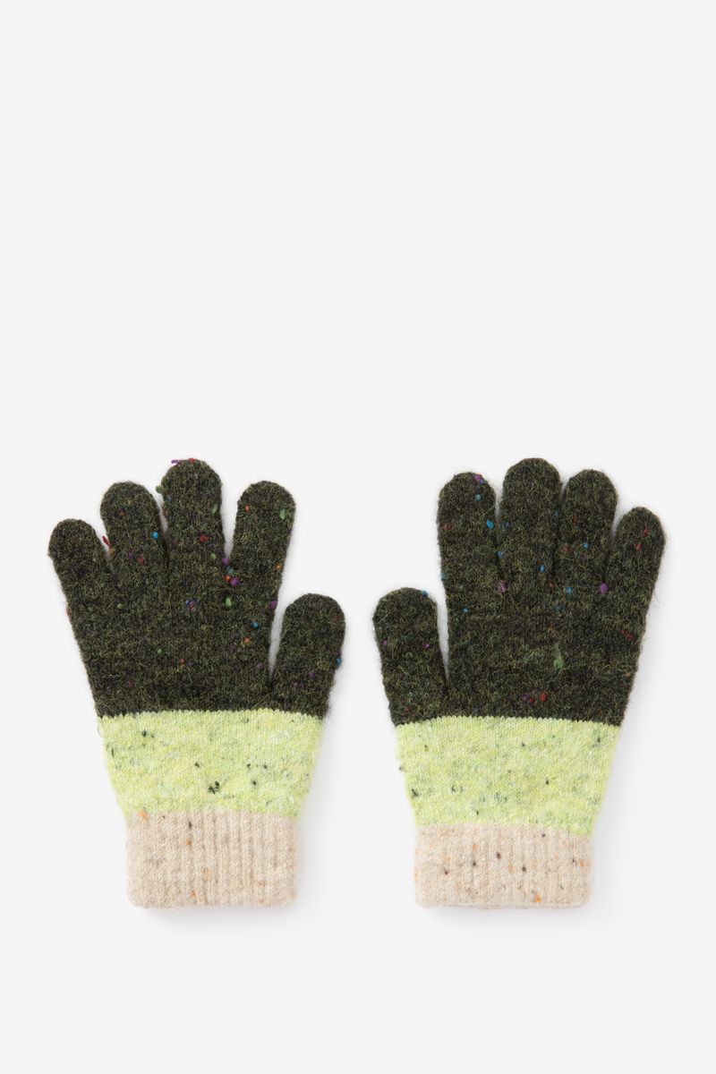 De gebreide handschoenen hebben een lichtgroene, beige en donkergroene colourblock met gekleurde ingeweven stipjes. Donkergroene colourblock handschoenen van Sissy-Boy.