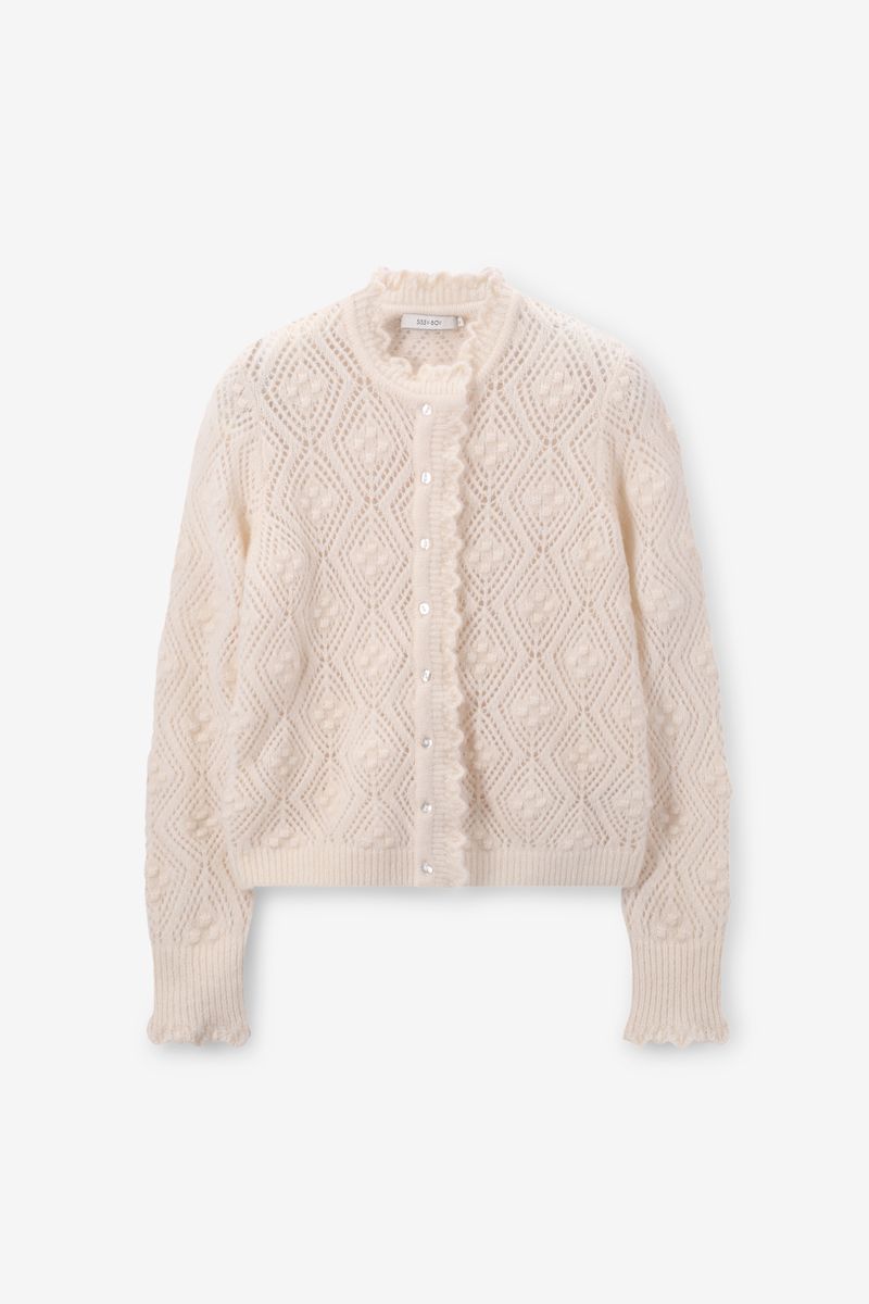 Verder heeft het vest een all-over opengewerkt ajour patroon in de stof verwerkt en ruffles rond de uiteinden. Het vest heeft lange mouwen, ribboorden, knoopsluiting en een regular fit.