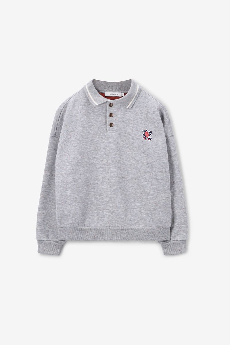 Verder heeft de sweater ribboorden, subtiele kleuren spikkels in de stof verwerkt en een geborduurd artwork op de linkerborst. De sweater heeft lange mouwen, een polo kraag, een knoopsluiting aan de bovenzijde, verlaagde schouders en een relaxed fit.