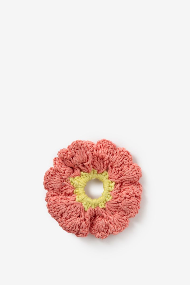 De scrunchie heeft een roze en gele kleur met een gehaakte textuur. Roze crochet scrunchie van Sissy-Boy.