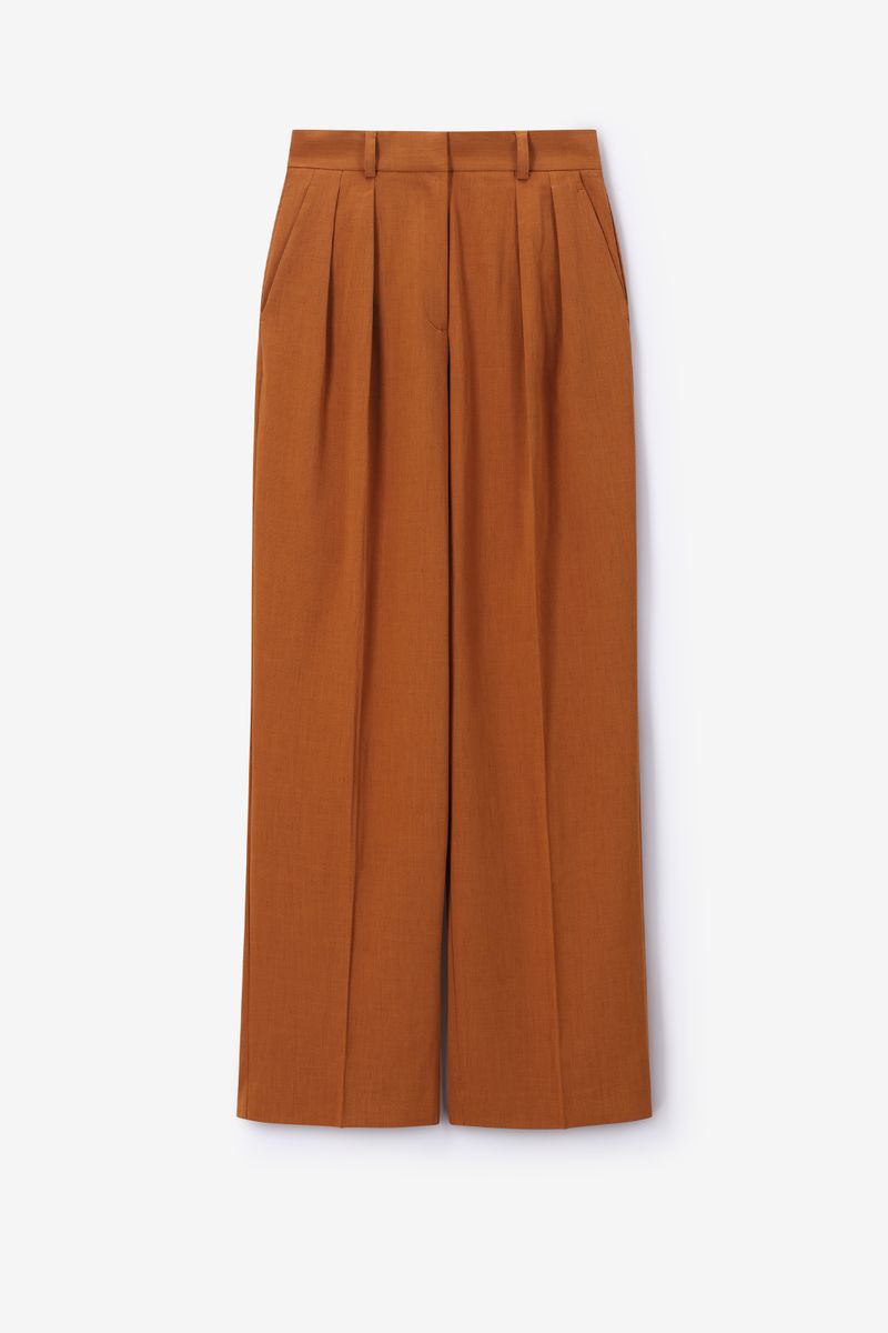 Het model heeft een lengte van 1,77 en draagt maat S. Verder heeft de broek plooi detail en een bruine kleur.