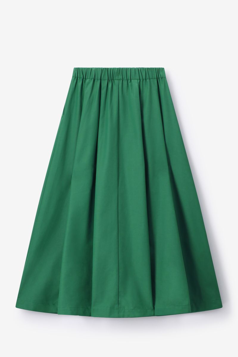 Het model heeft een lengte van 1,77 en draagt maat S. Verder heeft de rok een groene kleur en geplooide details.