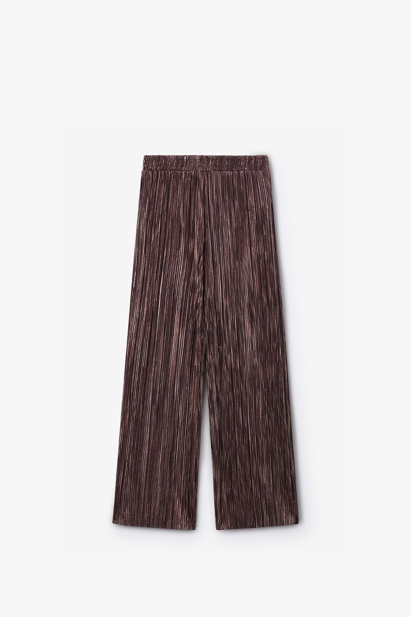 Verder is de broek gemaakt met een plissé kwaliteit stof met goudkleurige details. De broek heeft een elastieken tailleband en loopt wijd uit.