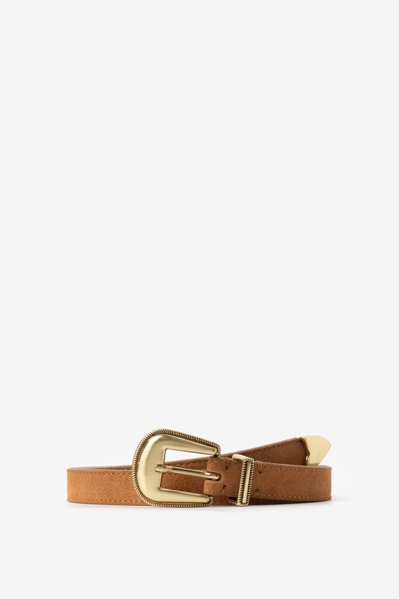 De riem heeft een bruine kleur en een gouden gesp. Bruine riem met een metalen gesp van Sissy-Boy.