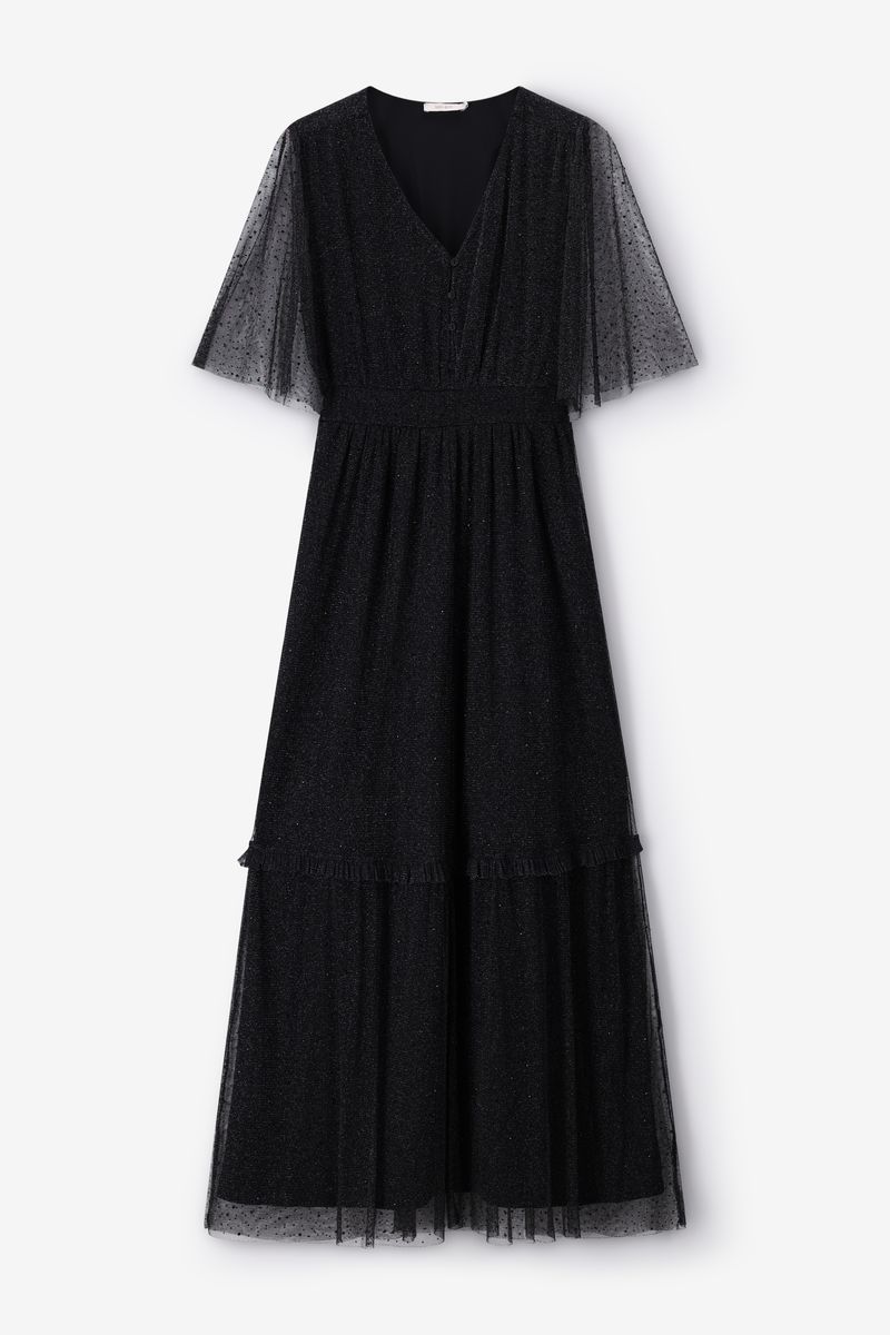 De jurk heeft korte mouwen, een V-halslijn, knoopsluiting, ruffle detail en een elastische tailleband. Zwarte mesh maxi jurk van Sissy-Boy.